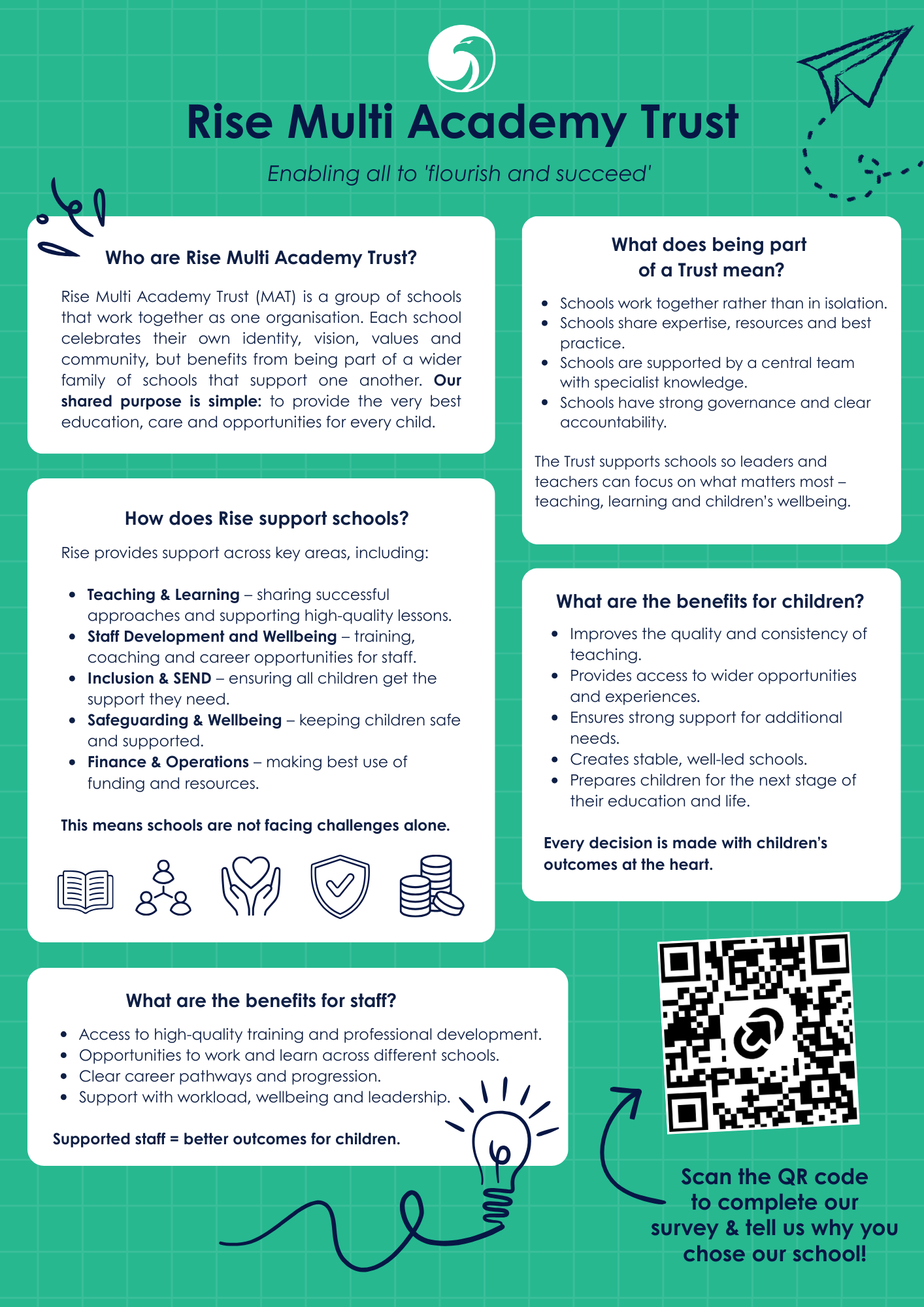Our schools each have their own vision and values. Many schools had these before they joined the Rise family. These all complement the work of Rise to enable pupils and staff to ‘flourish and succeed’. Read more about the Rise vision and values at this link Vision & Values - Rise Multi Academy Trust